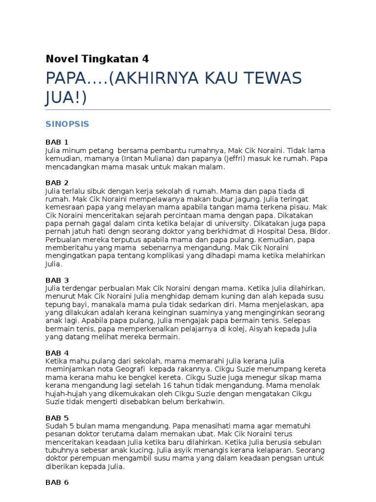 Perasaan sakit akhirnya berganti nikmat. Papa dengan tabah merawat aku sebagai single parent. (akhirnya kau tewas jua) ialah sebuah novel sastera remaja yang menjadi buku teks komsas tingkatan empat di malaysia mulai 2010 sehingga 2015. Jadi, selama ini saya udah nganggap dia seperti papa kandungku, toh saya juga nggak ingat akan kehadiran papa kandungku. Drama sepentas novel tingkatan 4 karya deana yusof oleh pelajar dari smk usj 23, selangor. Oya, aku gadis keturunan cina dan pakistan. Novel ini digunakan oleh semua murid. Baru kali ini aku merasakan kenikmatan yang tiada taranya. Pepagi selepas subuh dah bergerak ke pancor jaya di seremban.di mana bihun dan karipap pusing si sheila dah tunggu. Papa…(akhirnya kau tewas jua!) sinopsis: Nota rujukan novel papa (akhirnya kau tewas jua.) ini hidup kau and you decide on the routes of your life journey. Pusat pengajian umum, universiti kebangsaan malaysia. Vs monolog dalaman teknik plot percakapan batin sesuatu watak bukan bertujuan untuk berkomunikasi tetapi untuk menyatakan sesuatu keadaan papa ada di sini?